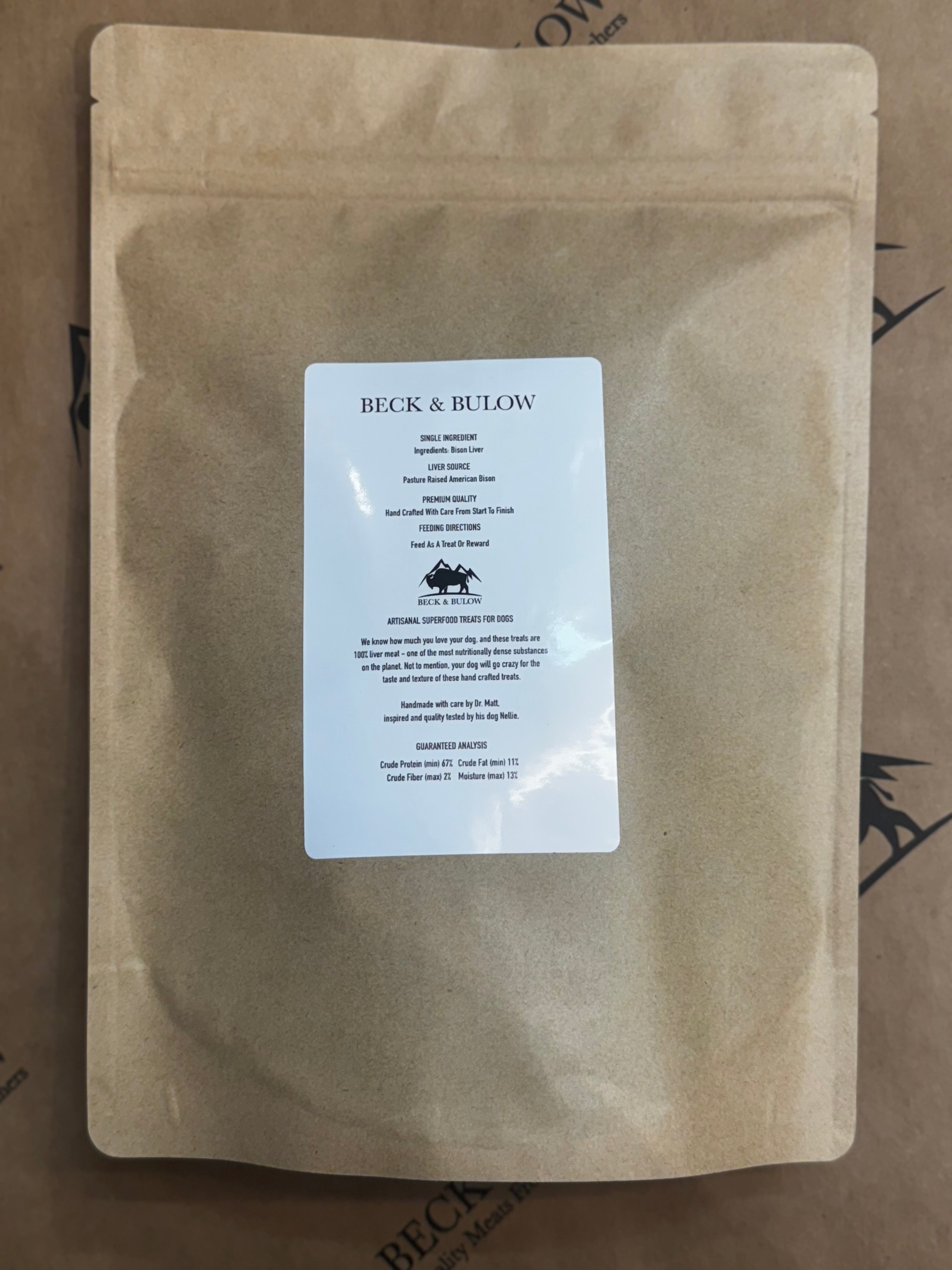 Physical Description: Indulge your furry friend with our 8oz packages of Super Food Treats for Dogs made from free-range and grass-fed bison liver! With each pack containing healthy and tasty treats, you'll have the perfect gift for your loyal companion.