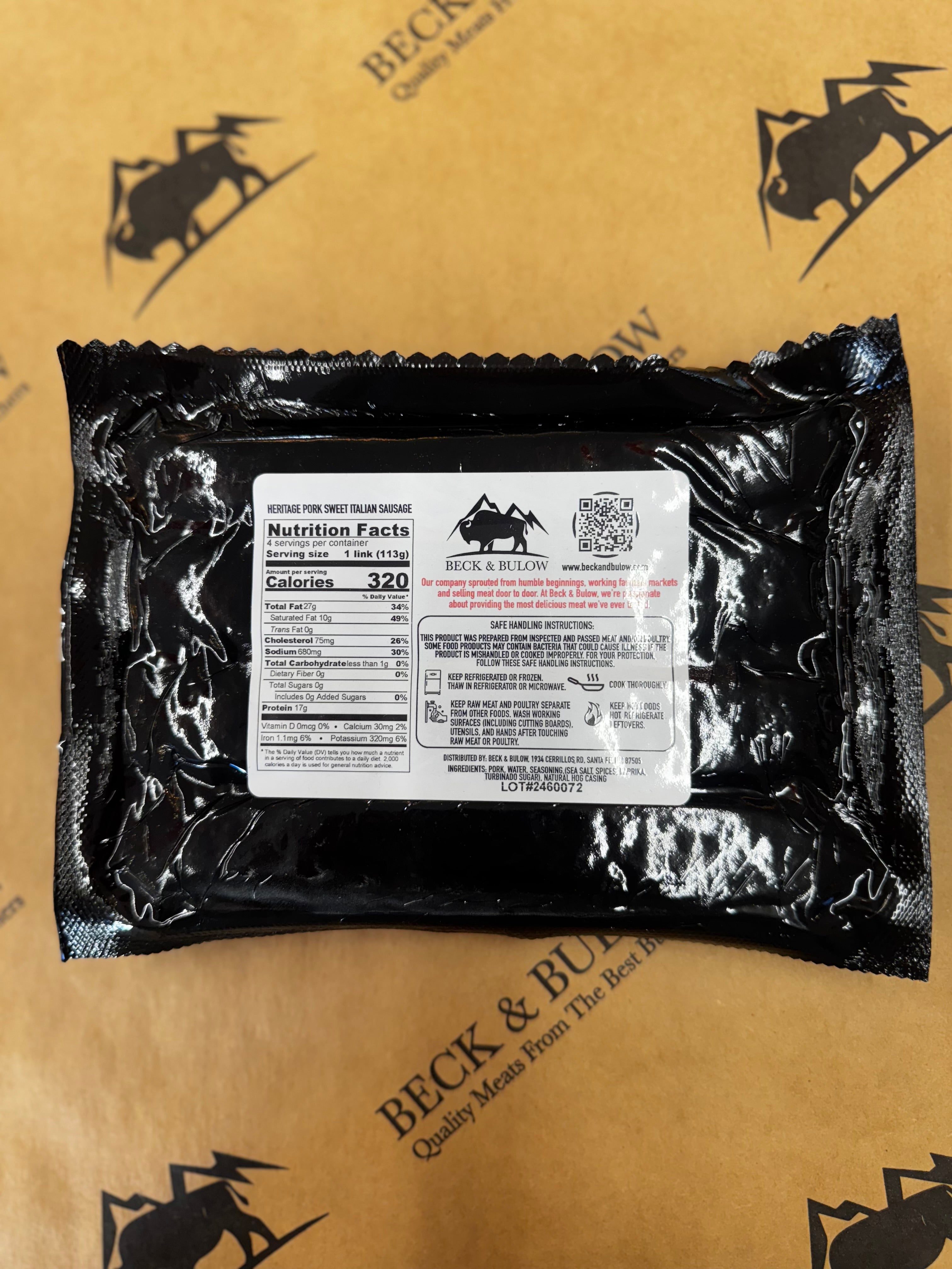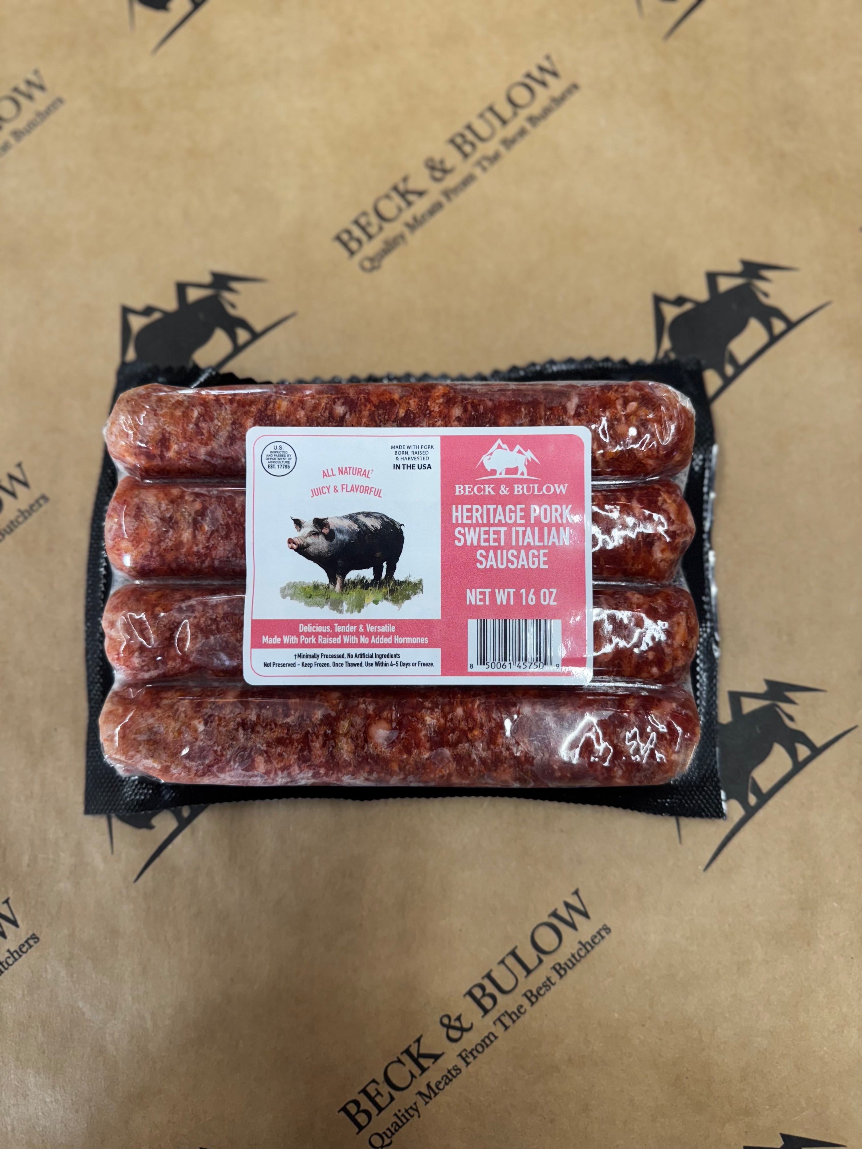 Enjoy the pure, rich taste and clean ingredients of our heritage pork sweet Italian sausages. 1 lb package with 4 links—add to cart today and elevate your next meal with premium, nitrate-free pork sausage.