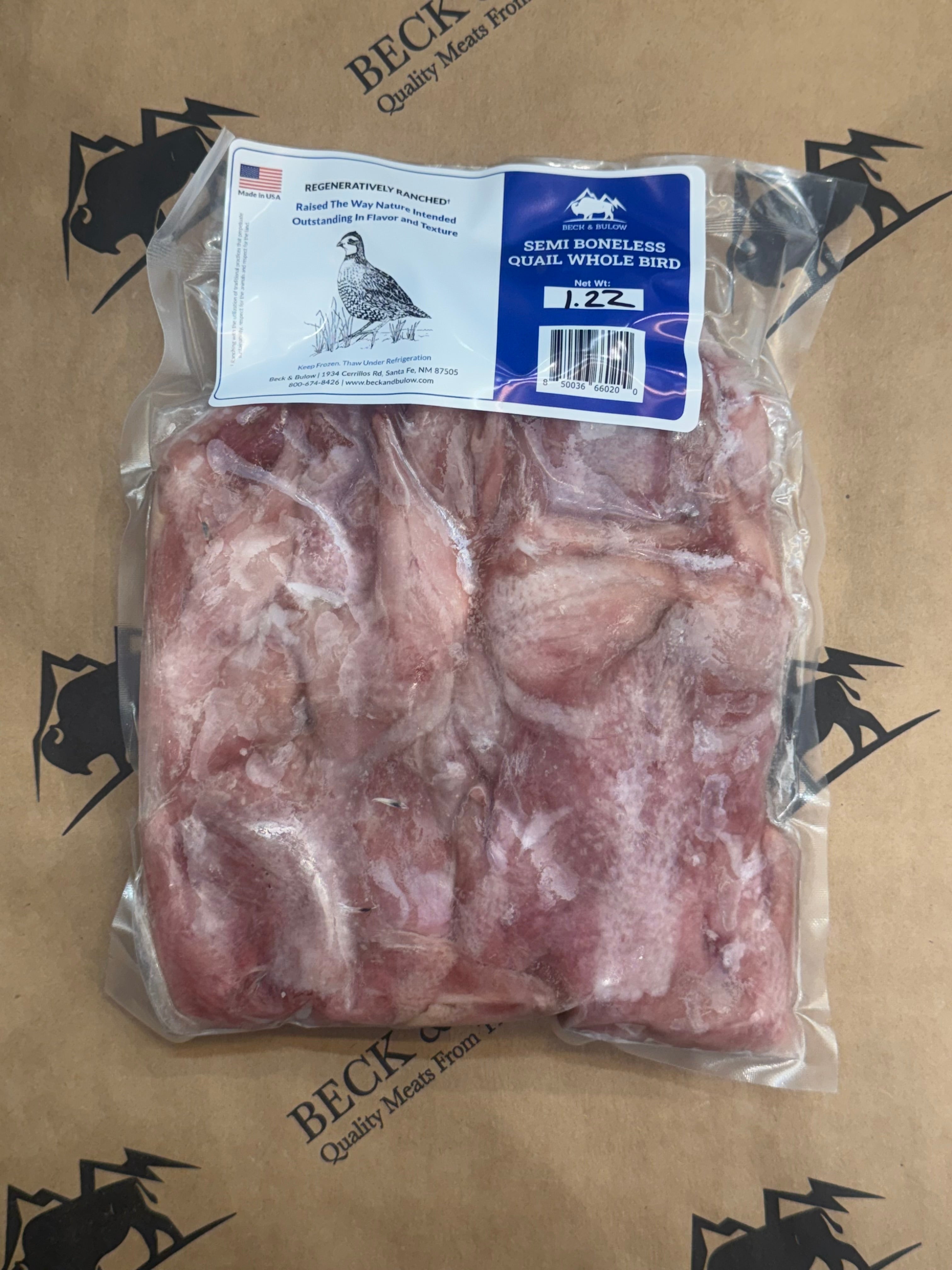 Physical Description: Introducing the Beck & Bulow Quail semi boneless whole birds, a delicacy for those who appreciate the unique flavors of quail. Each package contains 4 perfectly sized quail each about ~4-5oz, expertly deboned to enhance your dining experience. These whole birds showcase a plump and succulent texture with a rich brown color, offering an elegant centerpiece for your gourmet meals.